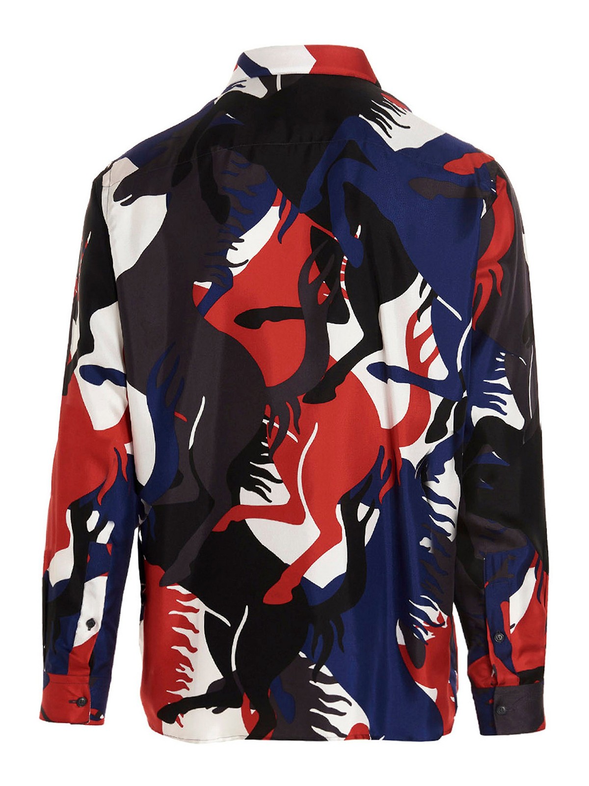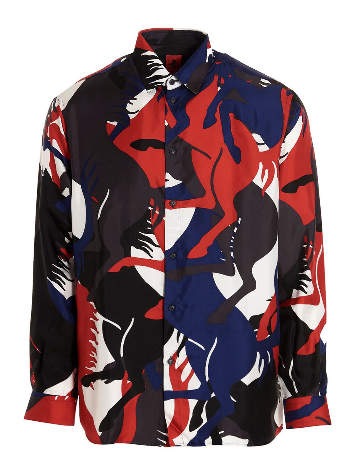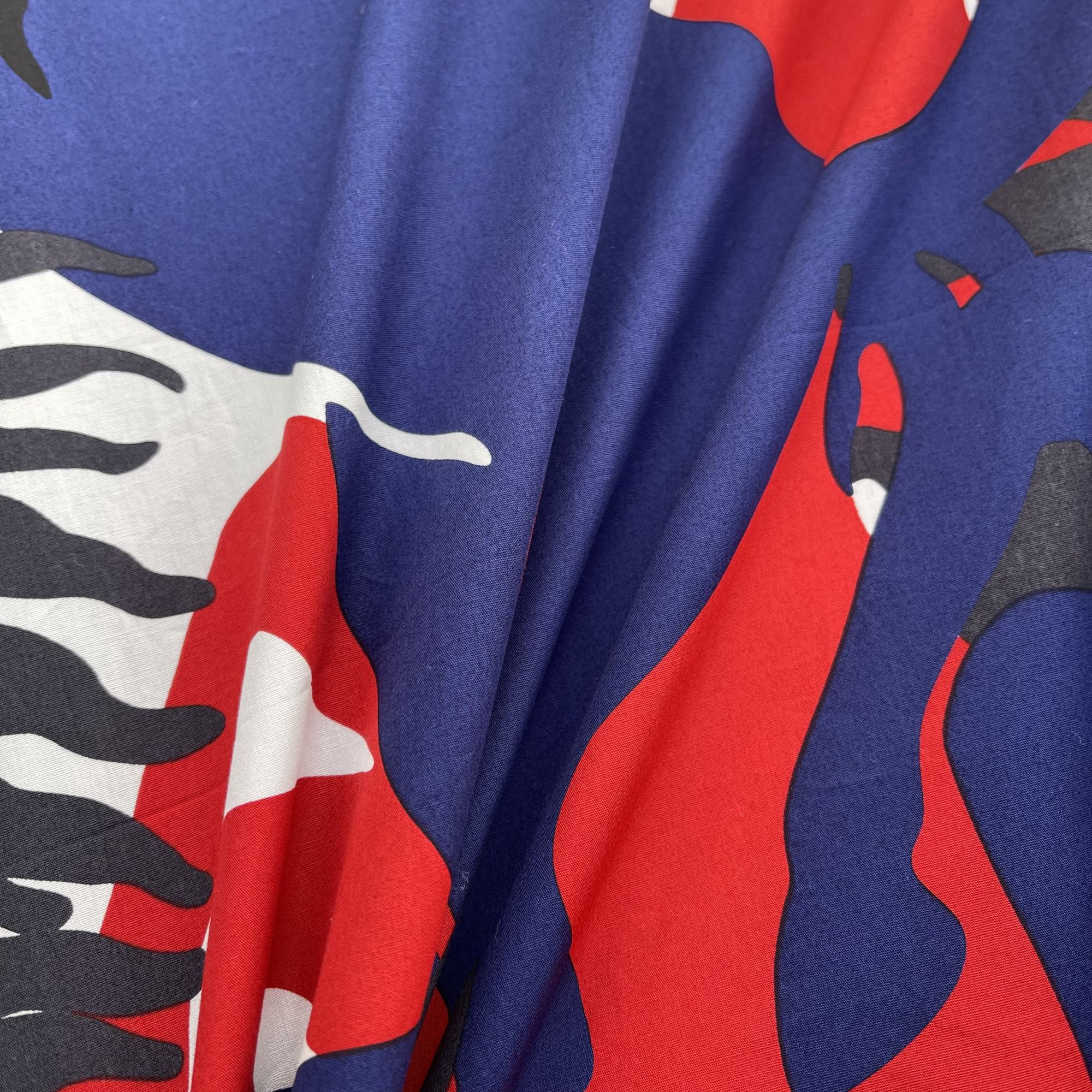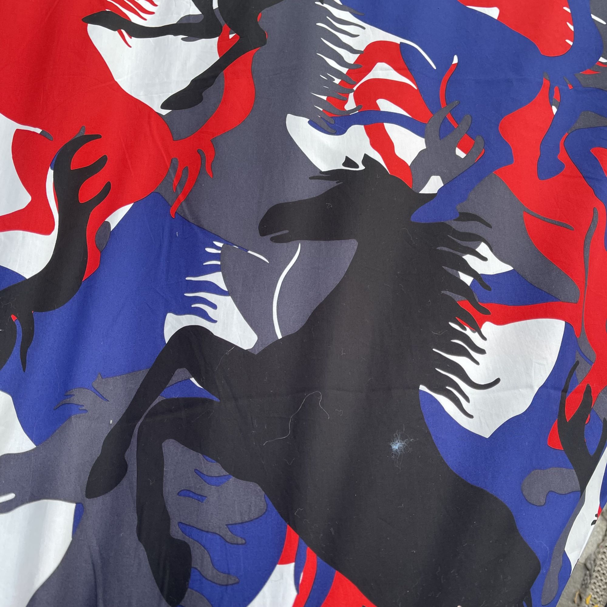 Hochwertiger Baumwollstoff mit springenden Pferden in blau, rot, schwarz. Diese klassische Baumwolle ist ein Designerstoff einer italienischen Automarke in sehr guter Hemden- und Blusenqualität.